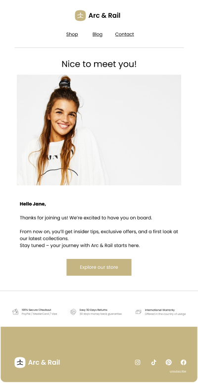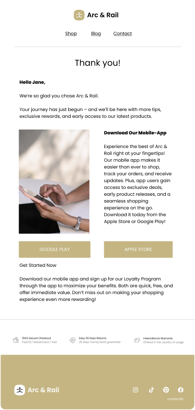 When a user subscribes to the newsletter, the system verifies Email consent = TRUE and adds them to the Newsletter list. After one hour, they receive a welcome email introducing the brand and setting expectations. Four days later, an educational message follows, sharing tips or inspiration. If no purchase occurs, a discount offer is sent after three more days, followed by a social proof email with bestsellers. Depending on user behavior, the final message adapts – sending “Stay Connected With Us” with or without a purchase.