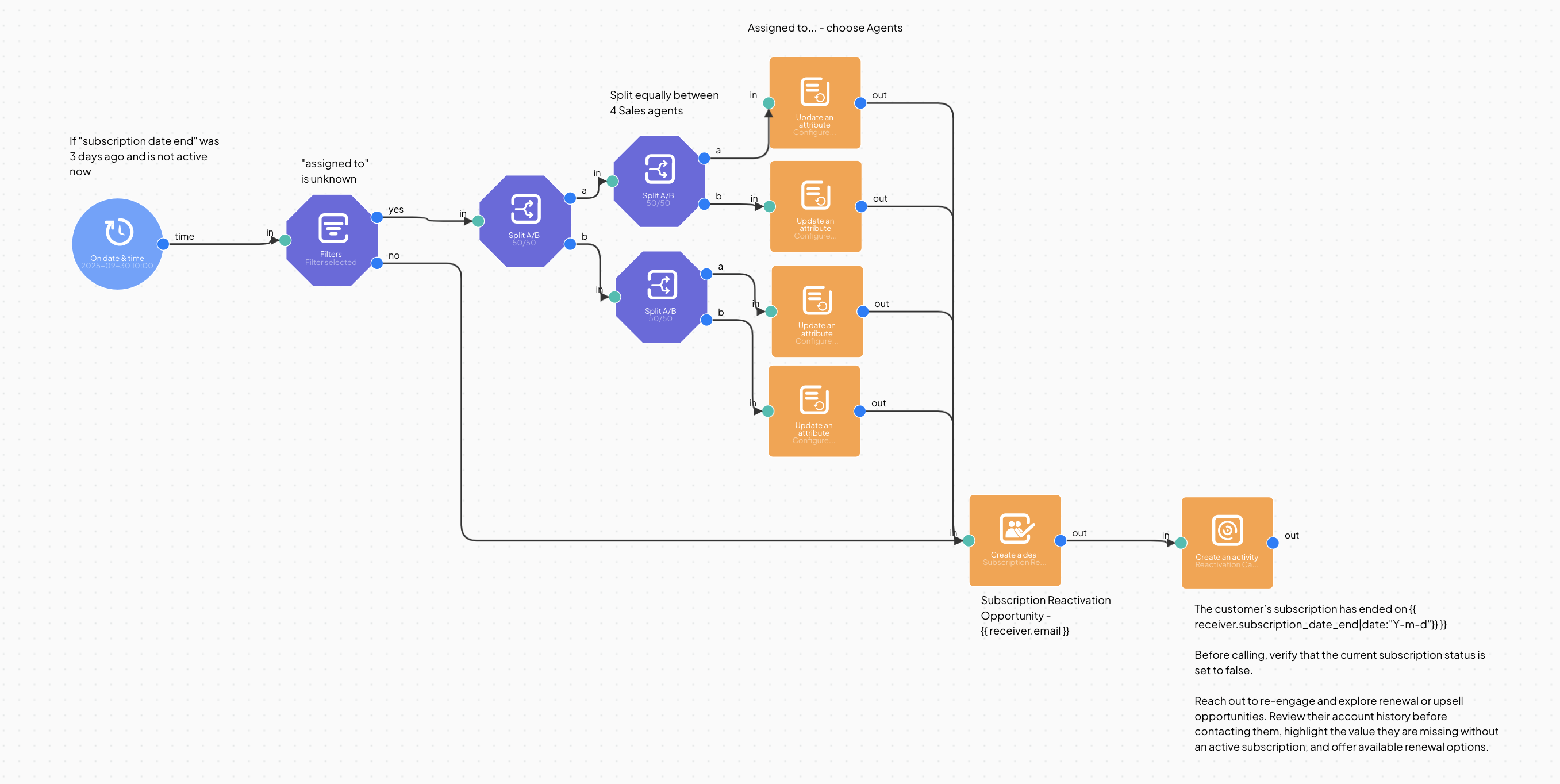 A contact’s Subscription active status is checked daily. If the Subscription date end was exactly 3 days ago and the subscription is still inactive, the workflow starts. If the contact already has an Assigned to agent, the system immediately creates a Deal and a follow-up Activity for that agent. If there is no owner, the system fairly distributes the lead by randomly assigning one of four sales agents (25% each). It then creates a Deal and a follow-up Activity for the newly assigned agent. This flow gives customers a brief “cool-off” window, then prompts a timely, personal outreach to win them back.