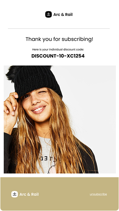 User fills a newsletter subscription pop-up and gets an opt-in email with a 10% discount incentive.