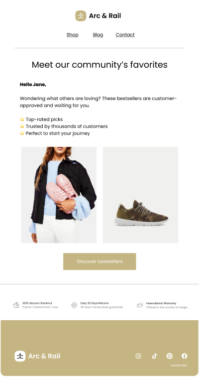 When a user subscribes to the newsletter, the system verifies Email consent = TRUE and adds them to the Newsletter list. After one hour, they receive a welcome email introducing the brand and setting expectations. Four days later, an educational message follows, sharing tips or inspiration. If no purchase occurs, a discount offer is sent after three more days, followed by a social proof email with bestsellers. Depending on user behavior, the final message adapts – sending “Stay Connected With Us” with or without a purchase.